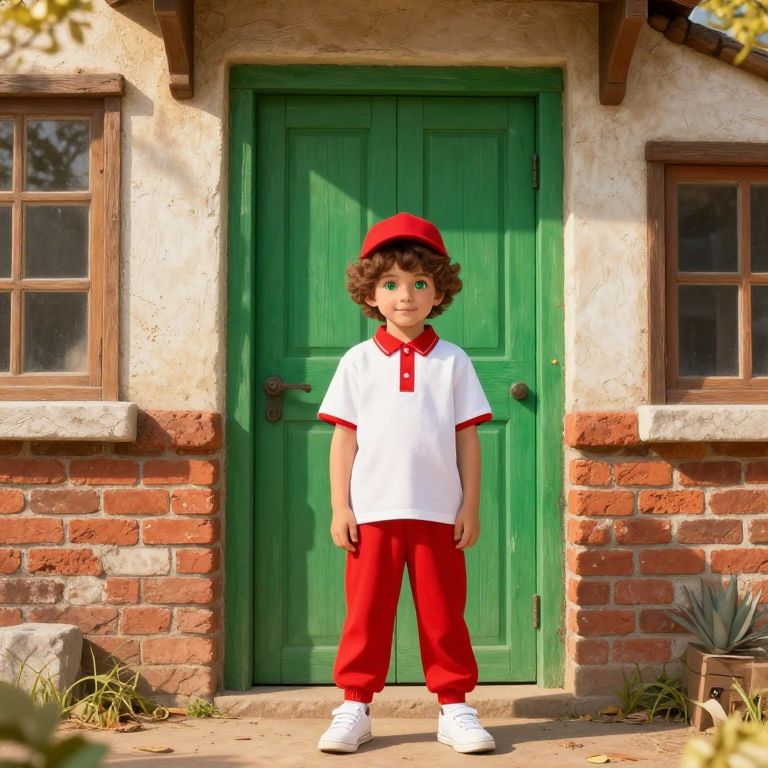 A young boy, around 7 years old, with curly brown hair and bright green eyes, is wearing a red and white outfit with a red hat and white sneakers. He is standing confidently in front of a charming old-style building with a large green door, weathered brick walls, and a small window with a wooden frame. The scene is set in a sunny afternoon, with soft golden light filtering through the trees in the background, giving the image a warm and nostalgic atmosphere.