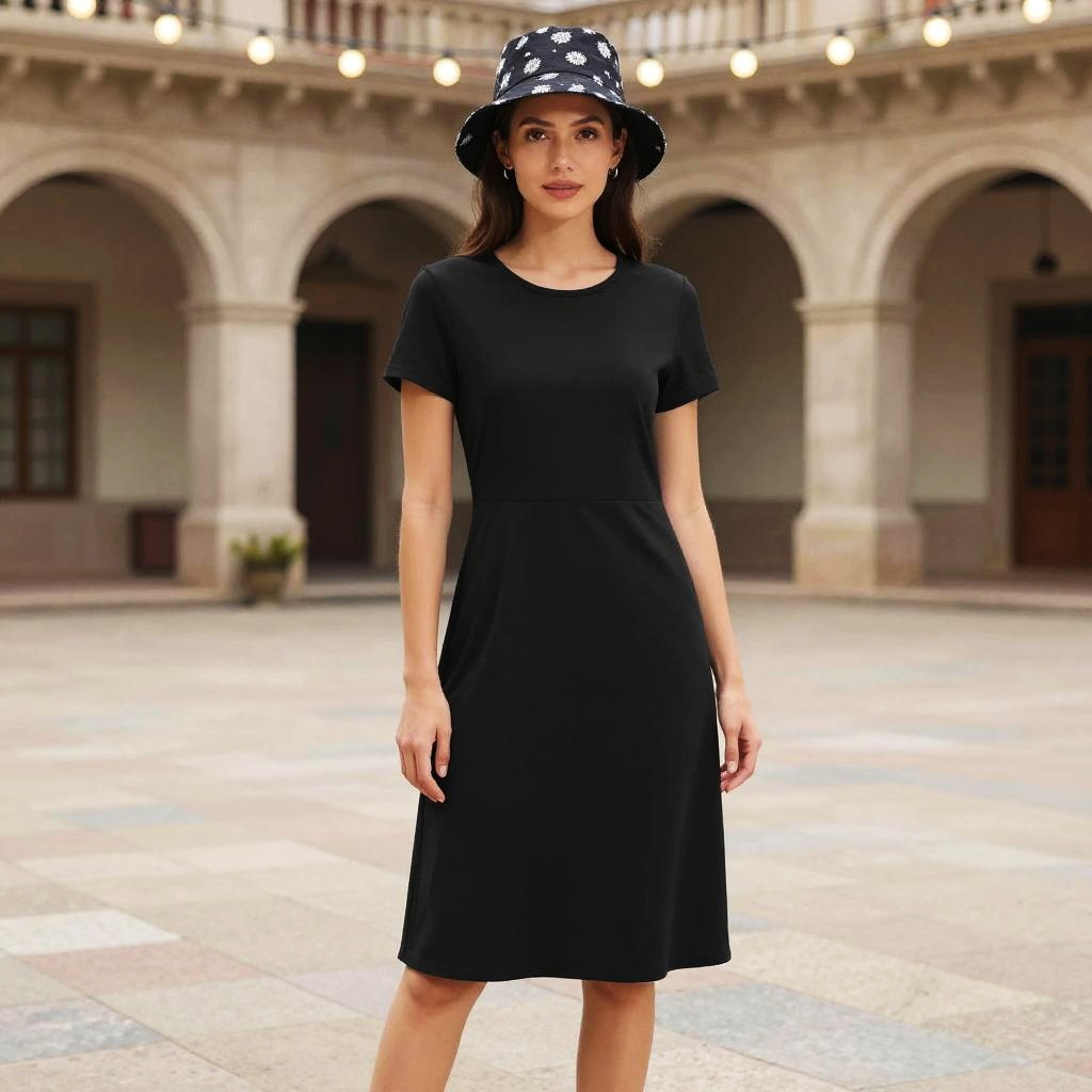 A toned woman in a casual minimalist black A-line dress, above-knee length with a simple round neckline, paired with a patterned bucket hat featuring white floral motifs, clean makeup, standing under string lights in a historic plaza, captured in a production IG visual style. Sexy. Pretty face and beutiful eyes
