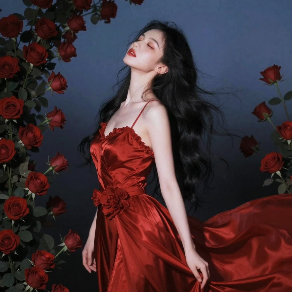 A digital painting of a beautiful woman with long, wavy black hair, wearing a flowing, red satin dress with a flower detail at her waist. She's standing in a dramatic, dimly lit setting with vibrant red roses on either side. Her dress swirls around her as she tilts her head back, eyes closed, with a serene expression. The background is a soft blue, adding contrast to the red.