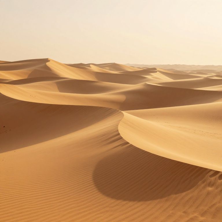 Photograph of a sunlit desert landscape featuring undulating sand dunes. The dunes are bathed in warm, golden sunlight, casting long shadows that emphasize their smooth, rippled textures. The sand is a rich, orange-brown color, and the sky above is a bright, almost white, gradient, indicating either dawn or dusk. The image captures the serene, yet harsh beauty of the desert, highlighting the intricate patterns created by the wind in the sand. The overall composition is minimalistic, focusing on the natural forms and light interplay in the desert environment.