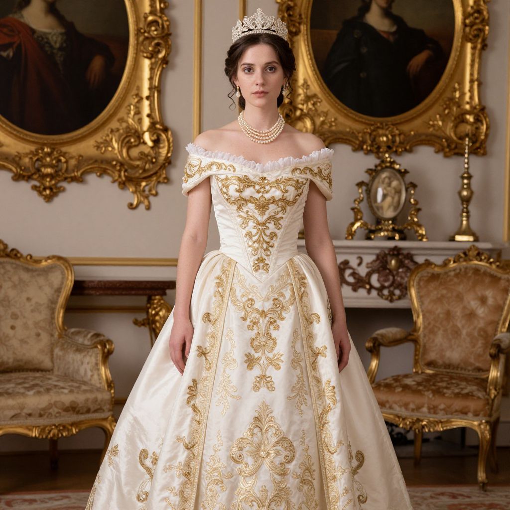 Elegant Rococo-inspired gown featuring off-the-shoulder detailing, gold embroidery, and a fitted bodice, worn by a woman adorned with a tiara and pearl necklace, set against a backdrop of ornate 18th-century decor including gold-framed portraits, a fireplace, and plush furnishings.