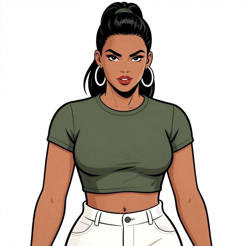 Digital illustration of a confident Latina woman with dark hair in a high ponytail, wearing a green crop top and white high-waist pants, large