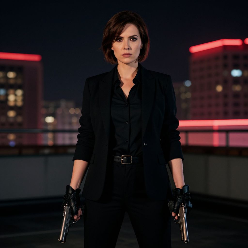Photograph of a serious-looking woman with short brown hair standing on a rooftop at night. She's wearing a black blazer, black shirt, and black pants with a belt, holding two black gloves and two guns in each hand. The background shows a cityscape with brightly lit buildings and red neon lights, adding a dramatic contrast to her dark outfit. The lighting highlights her determined expression.