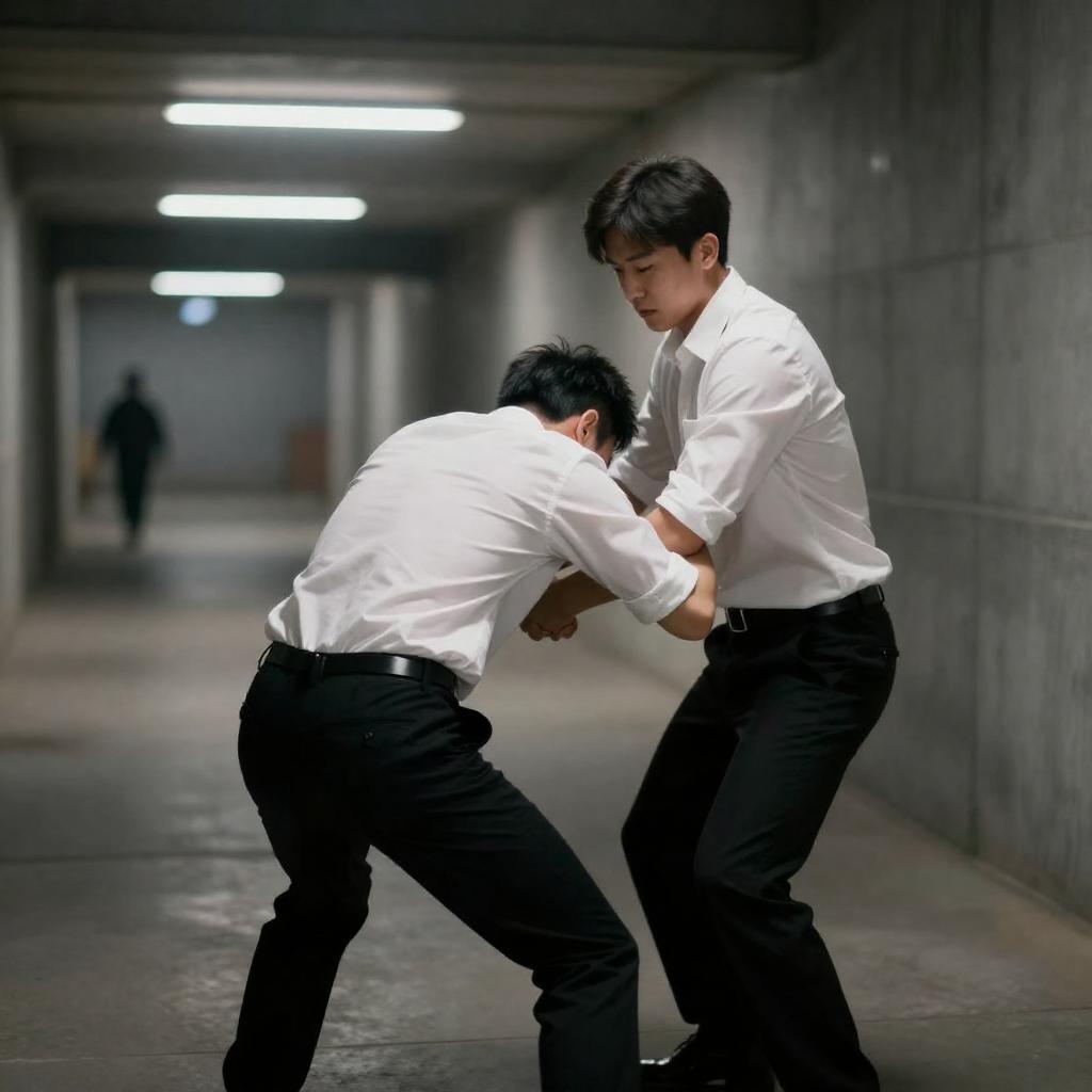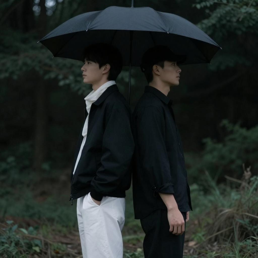 Photograph of two silhouetted men standing against a sunset sky. The man on the right wears a baseball cap and dark jacket, gently touching the shoulder of the man on the left, who wears a plaid shirt. Brick wall in the background. Warm orange and yellow hues in the sky.