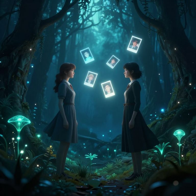 A digital art image depicts two young women with long brown hair, dressed in dark, knee-length dresses, standing in a luminous, mystical forest. They face each other, surrounded by glowing, bioluminescent mushrooms and floating, ethereal photographs with white borders and small portraits in the center. The forest is dense with dark, twisted trees, and blue light filters through, creating a magical, otherworldly atmosphere. The women's expressions are calm and focused. The overall color palette is dominated by deep blues and greens, enhancing the surreal, enchanted quality of the scene.
