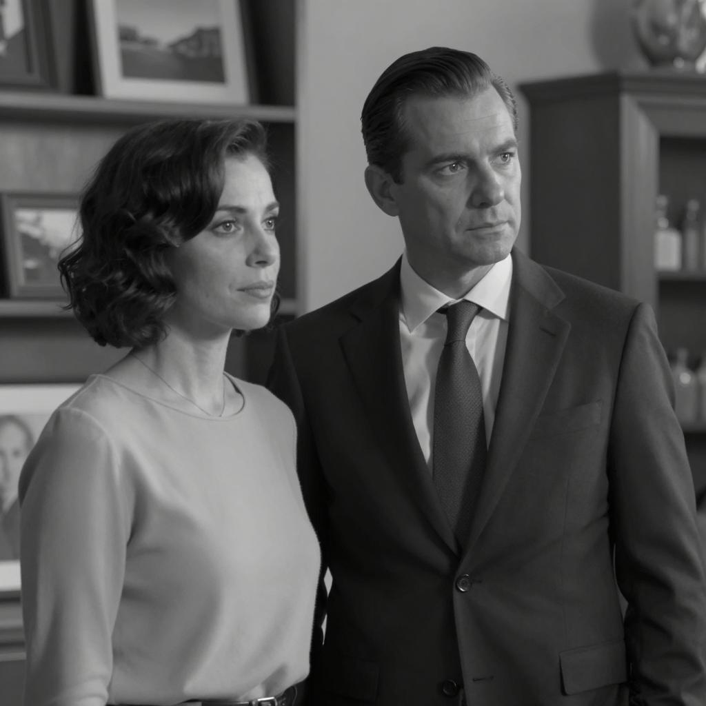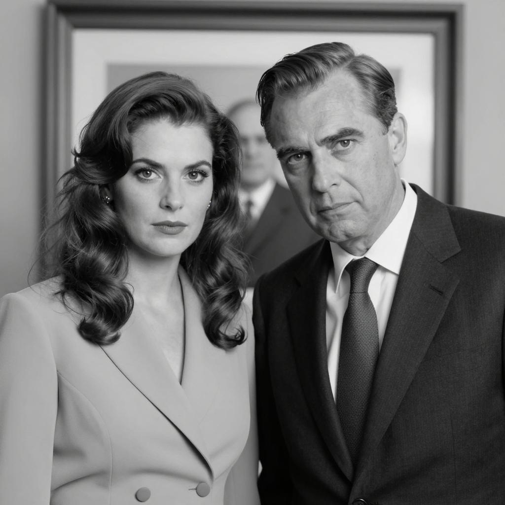 Black and white photograph of three people. Man in checkered suit and dark tie stands left, looking serious. Man in dark suit stands right, looking stern, with arm around woman. Woman in dress with pearl necklace stands center, looking forward. Background includes draped curtains and bookshelf. Both men have short, slicked-back hair. Woman's hair is curled. Man in checkered suit is in front, others behind. Woman is in middle.