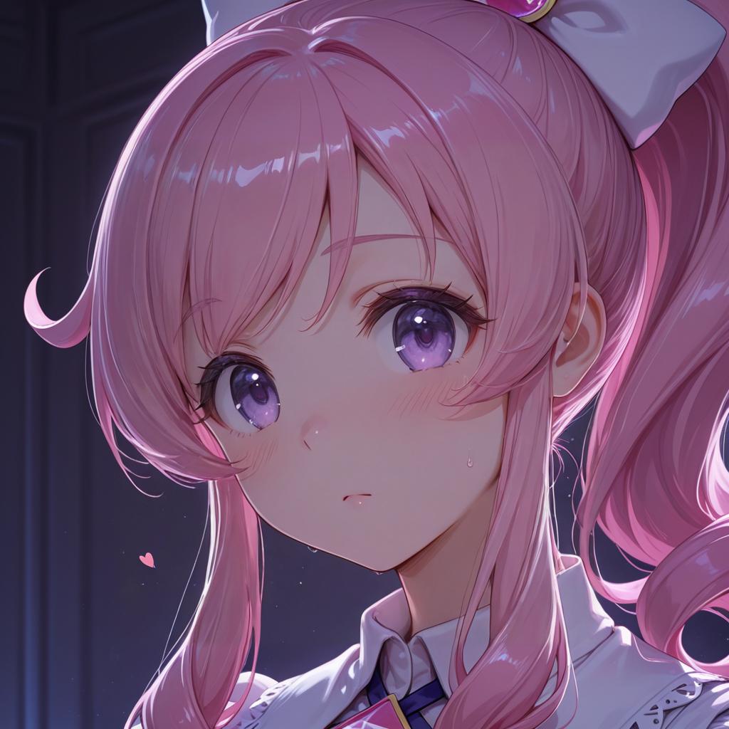 Momoyama mirai, pretty series, 1girl, blue eyes, purple eyes, pink hair, long hair, sidelocks, ponytail, high ponytail, hair bow, by artist yoekosukii, dark_illustrious