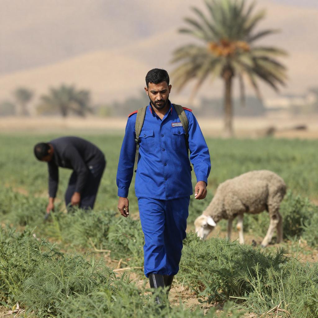 Photograph of a man in a blue military-style outfit with a backpack walking through a green field of plants. Behind him, another person in dark clothing bends over, while a sheep grazes nearby. Arid, hilly landscape with a palm tree in the background.
