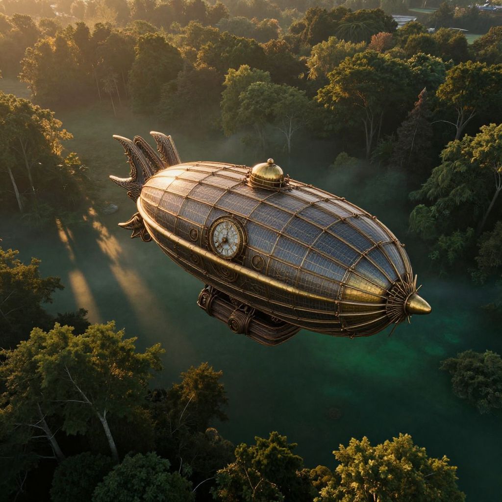 A captivating blend of steampunk and whimsical elements depicts a majestic airship soaring above an enchanting forest at dusk. The ship's design features intricate clockwork mechanisms and gleaming brass tubing juxtaposed with the elegant curves of its dragon-like hull, which shimmers in the soft twilight light. From an aerial perspective, witness the captivating play of golden sunlight filtering through the trees as it casts elongated shadows on the verdant foliage below, transitioning into a mystical emerald mist. This scene beautifully balances adventure and serenity, beckoning viewers into a fantastical world where technology and nature harmoniously coexist, stirring feelings of awe and exploration.