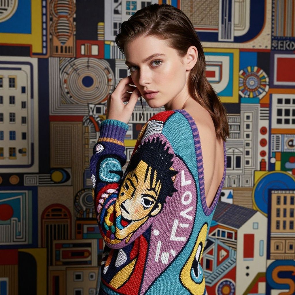 Professional fashion photography, concept art, De Stijl, best quality, high quality, masterpiece, 8K, UHD, extremely detailed, breakflat color, by Alfred Eisenstaedt and by hirohorn, breaka beautiful women, irresistible, super model, perfect anatomy, correct anatomy, anatomically correct, detailed face, detailed eyes, looking at viewer, elegant pose, breakkawaii, Open-back knit sweater designed by Eiichiro Oda and Andrew Christian and Anne Pratt, breakIntricately detailed background, random composition, diverse textures and patterns, mix of architectural styles, natural and urban elements, vibrant colors, varying lighting conditions, richly decorated, unexpected details, high resolution, visually complex, immersive environment, breakadvanced lighting techniques, high dynamic range, vivid and accurate colors, harmonious color scheme, meticulously detailed, visually stunning, emotionally engaging, sharp contrast, digital painting quality, cinematic quality, subtle shadows, Complex Shading, Immersive Depth, Advanced Rendering, Depth of Field, sharp focus, Depth and Perspective, bokeh, lifelike