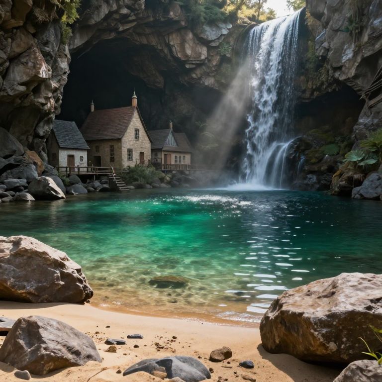 Minimalist Fashion a deep emerald clear lagoon with with sand and big rocks, a cave, morning light rays, hogsmeade village, waterfall,