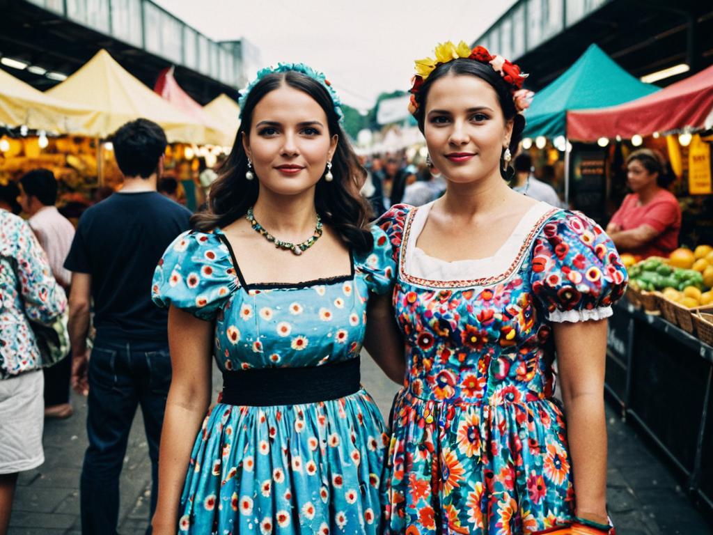 Two young women wearing traditional-style, colorful floral dresses and matching floral headbands standing together in a busy outdoor market with people and vendor stalls in the background. Both have dark hair and wear earrings, with confident expressions.