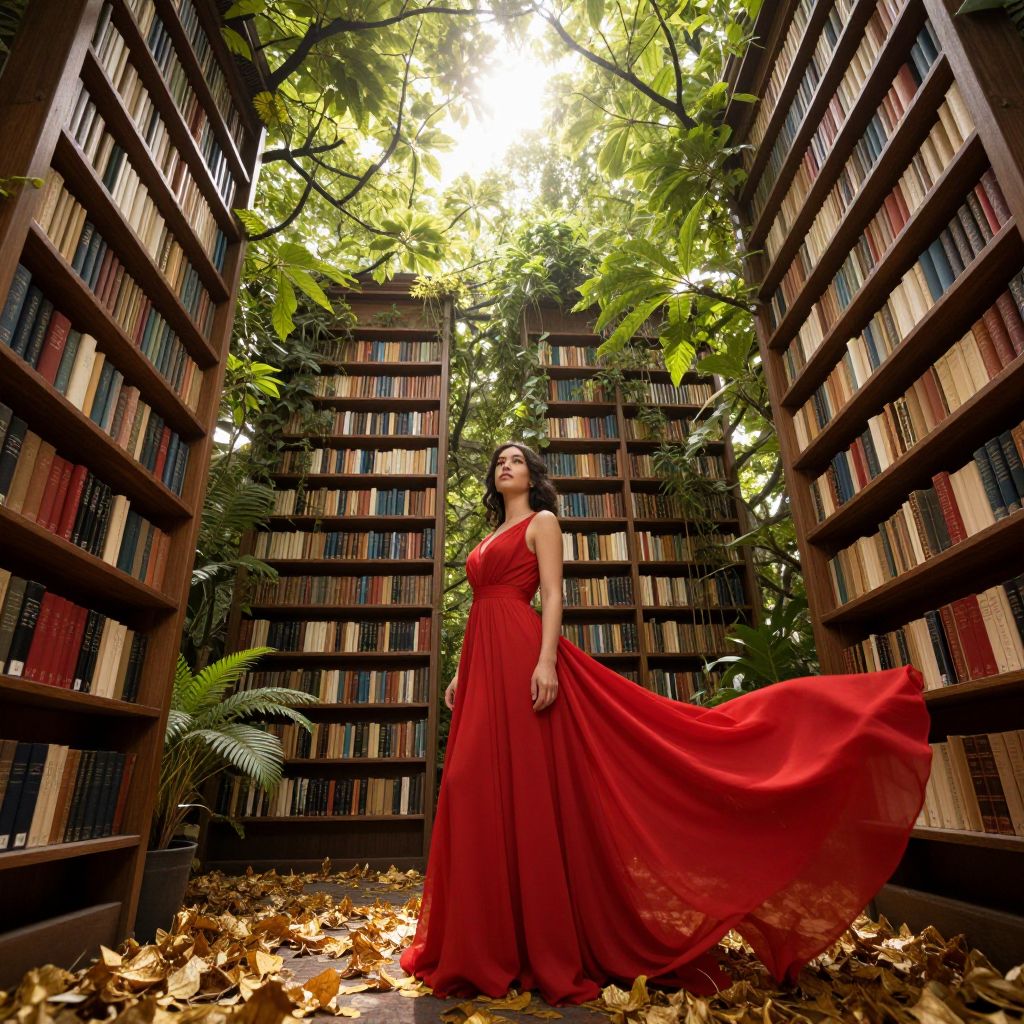 Elegant woman in a flowing red gown stands amidst towering bookshelves, surrounded by lush greenery and scattered golden leaves, as sunlight filters through the canopy above, creating a mystical blend of nature and literature.