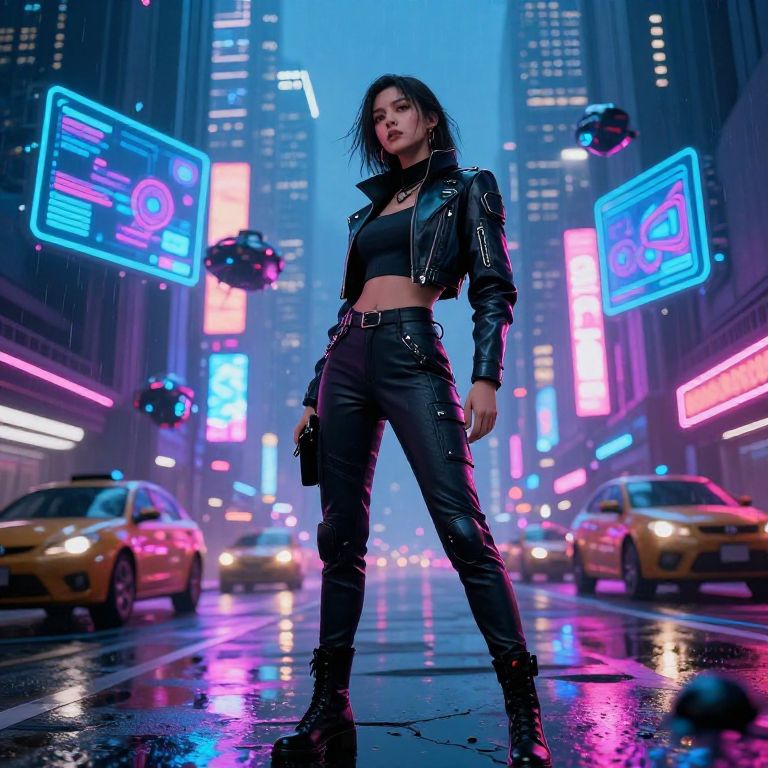 Clarisa in a futuristic cyberpunk cityscape, neon lights reflecting off rain-soaked streets, wearing sleek high-tech attire, surrounded by holographic displays and flying vehicles, rendered with a vivid palette and high contrast for dramatic effect.