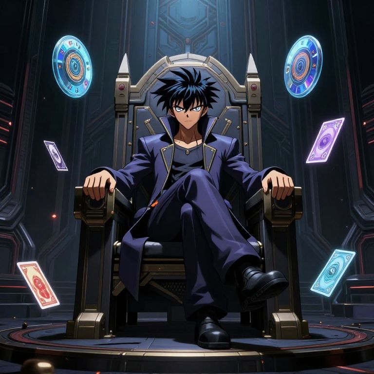 A digital anime-style illustration depicts a young man with spiky black hair, blue eyes, and a serious expression, sitting on a large, ornate throne. He wears a dark blue, high-collared robe over a black shirt and pants, with black boots. Floating around him are four glowing, circular magical cards and two smaller, falling cards. The background is a dark, futuristic room with blue and red lighting and intricate, metallic patterns. The throne has pointed, arch-like supports, and the young man's hands rest on the armrests, exuding an aura of power and control.