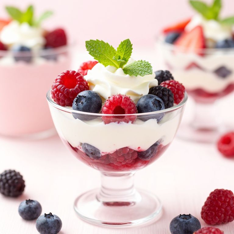 Close-up of a clear stemmed glass bowl with frosted floral patterns filled with sunny mixed berry sorbet, topped with fresh raspberries, blueberries, and mint leaves. The bowl is placed on a marble windowsill with natural window light highlighting the vibrant red and purple hues of the sorbet and berries. A few raspberries and a halved strawberry are also visible on the surface beside the bowl.