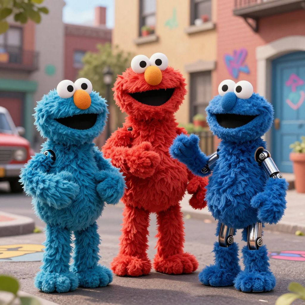 Sesame Street robots interacting with iconic characters, combining soft fabric textures with shiny robotic limbs, set in a cheerful, graffiti-decorated urban neighborhood, warm and inviting scene