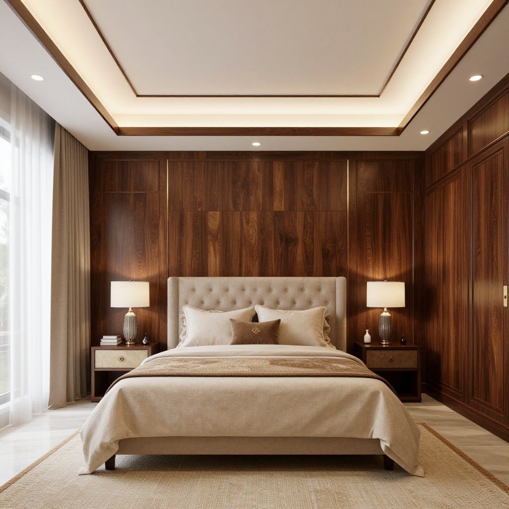 Ultra realistic, masterpiece, best quality, super detailed, ultra high res, raw photo, 8k, a modern bedroom with light grey, fabric bed, brown and white, in the style of enchanting lighting, light gold and light black, li shuxing, traditional-modern fusion, soft atmospheric light, hard-edged lines, stone opaque resin panel, large glass wardrobe, wooden floor, 32k, extremely detailed CG unity 8k wallpaper