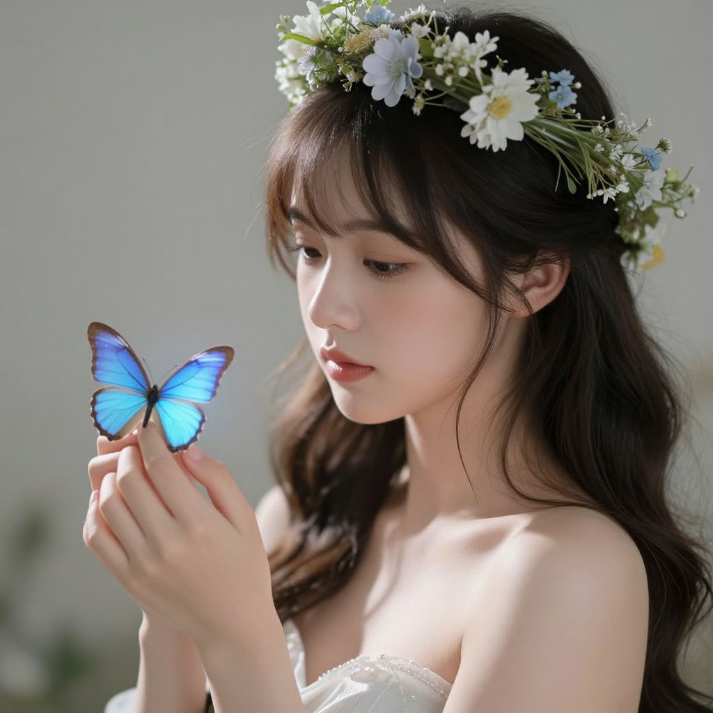 Photograph of an East Asian woman with long black hair, wearing a white lace top and a flower crown, gently holding a blue butterfly against a soft