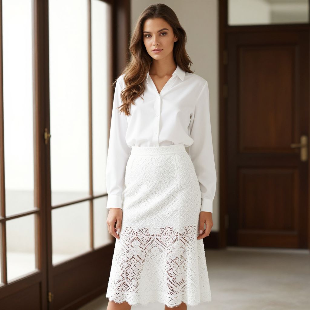 Female model with long brown hair, wearing a white shirt and a white skirt with a black lace pattern. She is standing in a room with a large window and a door in the background.