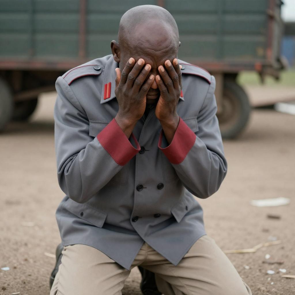 Photograph of a bald, middle-aged Black man with a distressed expression, kneeling on the ground, hands covering his face. He wears a grey double-breasted military-style jacket with red cuffs, beige pants. Background includes a blurred wagon and scattered debris. Intense, sorrowful facial expression.