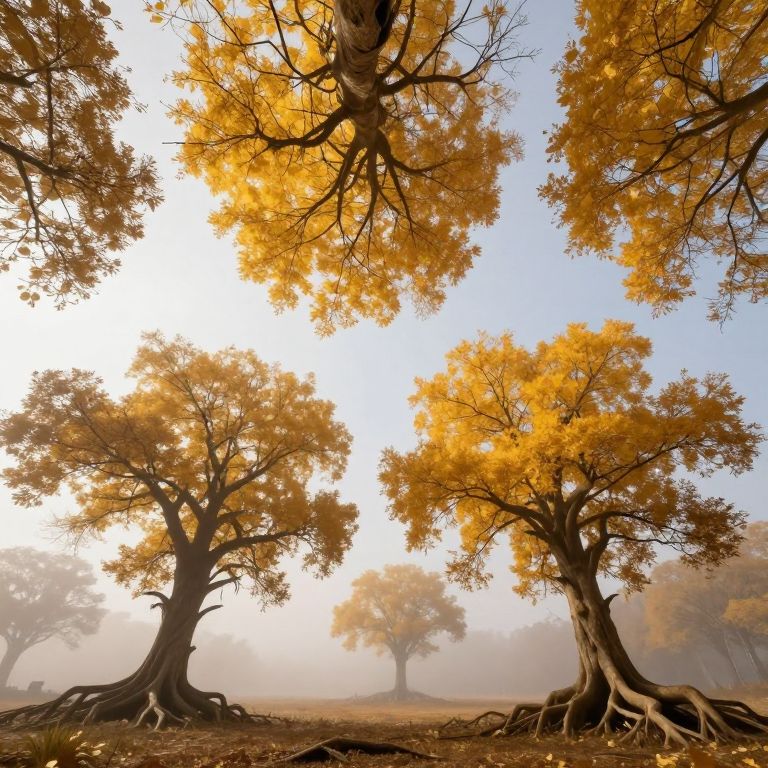 Photograph of a serene autumn forest scene featuring three large trees with vibrant golden-yellow leaves. The trees have thick, gnarled trunks with exposed roots. The background is misty, creating a soft, ethereal atmosphere, and the sky is a pale blue. Sunlight filters through the leaves, casting a warm glow. The ground is covered in fallen leaves and sparse grass. The image has a high contrast between the bright leaves and the misty background, emphasizing the autumnal colors and textures.