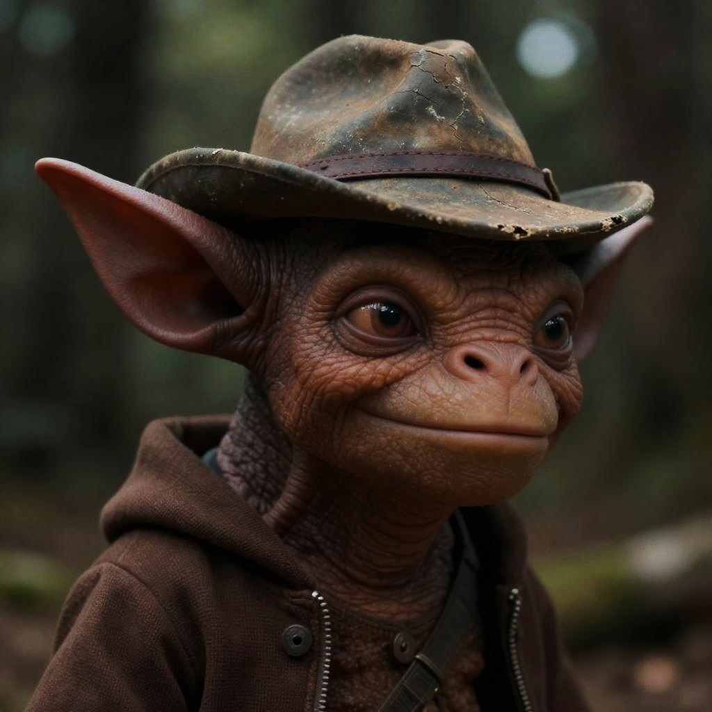 Close-up photograph of a fictional creature with large, pointed ears, wrinkled brown skin, and a weathered hat made from cracked material. Dark, blurry forest background. Creature's face shows a subtle, knowing smile. Brown, ured clothing.