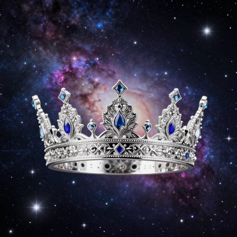 A digital illustration of a glittering silver crown adorned with large, teardrop-shaped blue gemstones, set against a vibrant, star-filled galaxy background. The crown features intricate, ornate patterns and is surrounded by a shimmering, cosmic nebula with hues of purple, pink, and blue. The gemstones are meticulously detailed, catching light to enhance their brilliance. The image combines elements of fantasy and space, creating a regal yet otherworldly atmosphere. The dark, star-studded background contrasts with the crown's bright, metallic sheen.