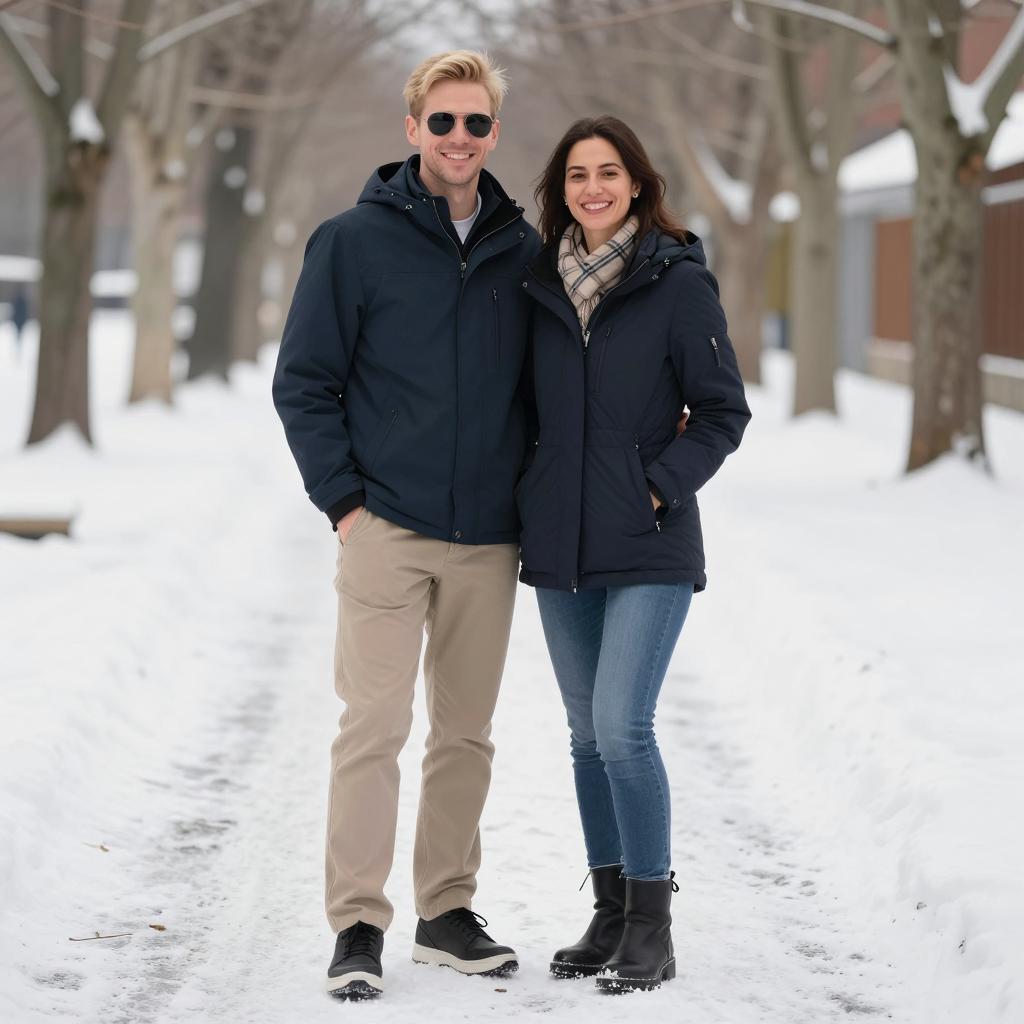 Couple standing outdoors on a snowy path. Man with short blonde hair, wearing sunglasses, navy jacket, beige pants, black shoes. Woman with dark brown hair, wearing plaid scarf, navy jacket, blue jeans, black boots. Both smiling. Leafless trees and snow-covered ground in background.