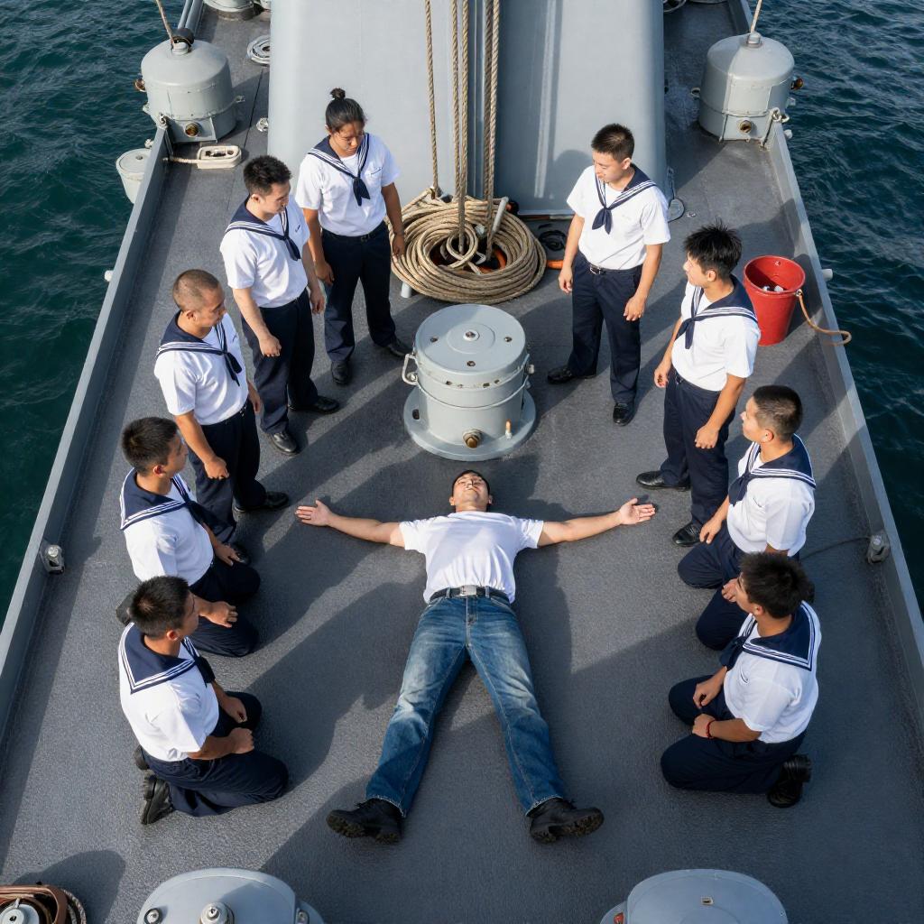 Overhead photograph of a naval ship. Man in white t-shirt and blue jeans, lying on deck with arms spread, eyes closed. Nine sailors around him, some standing, others kneeling. Ship's ropes, coiled cables, and circular device in center. Dark blue ocean surrounding ship. Bright sunlight casting shadows.