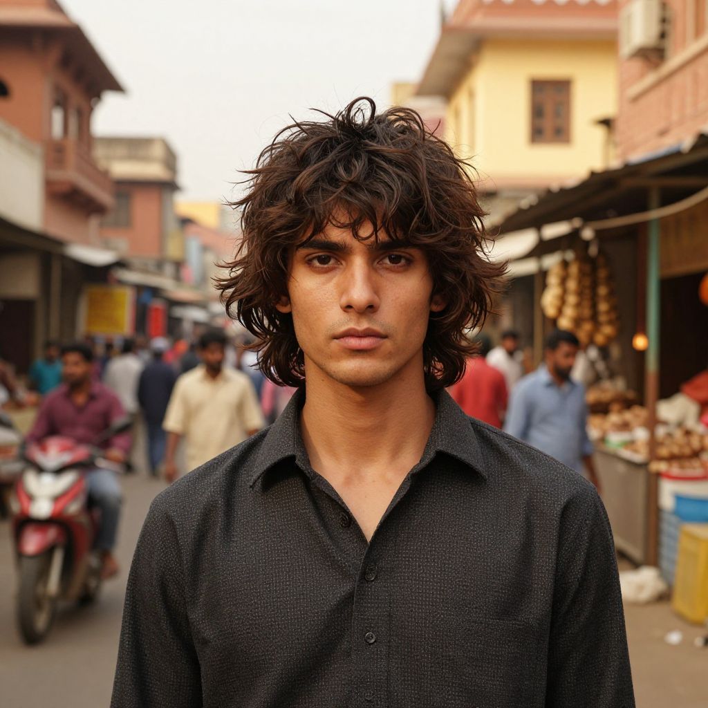 Indian mullet haircut on a male model standing in a bustling street market, traditional Indian architecture, warm golden hour lighting, detailed texture on hair strands, high fashion urban vibe, blending contemporary and classic Indian aesthetics.