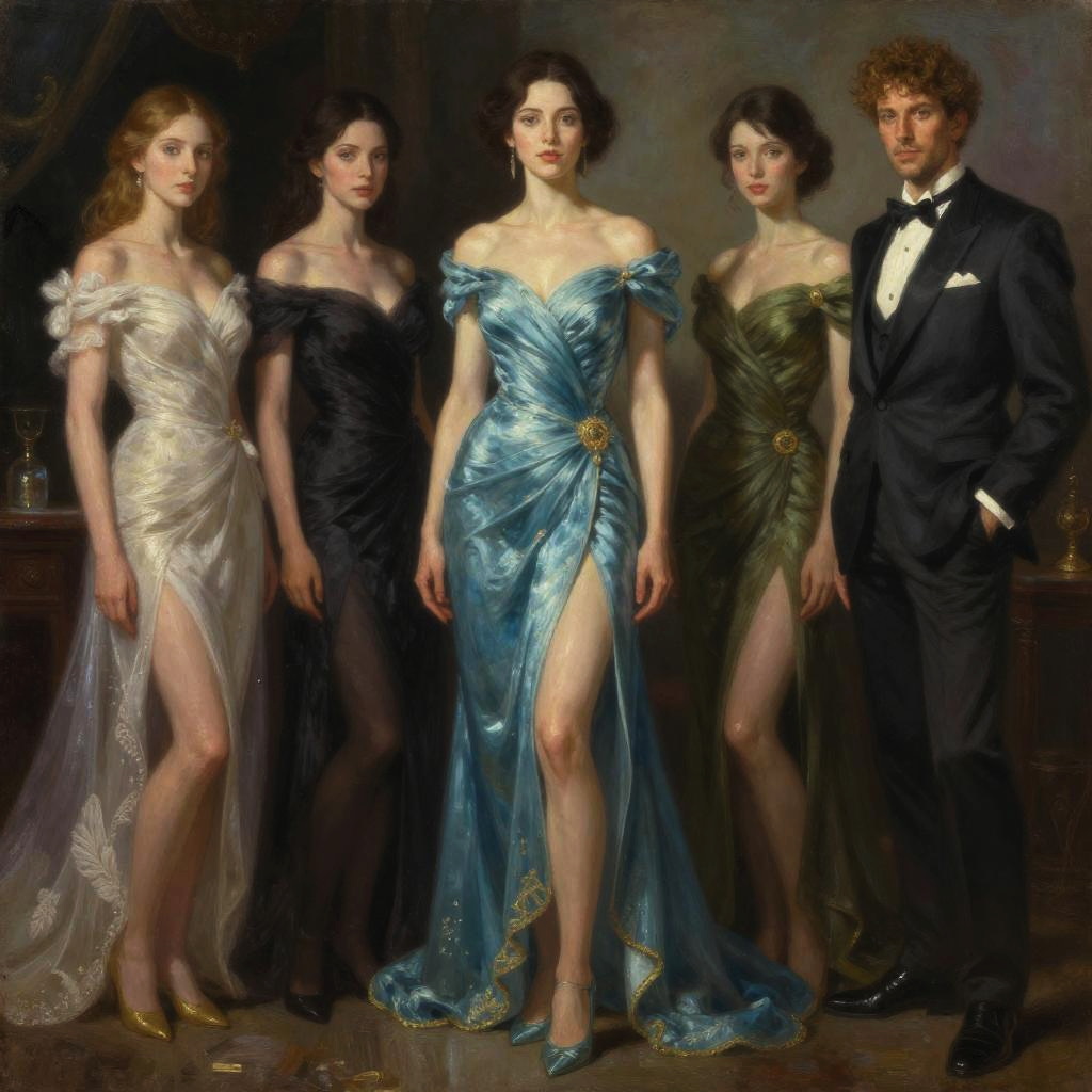 Photorealistic oil painting of five elegantly dressed individuals standing side by side. Four women wear off-shoulder, high-slit gowns in white, black, blue, and green, each adorned with decorative brooches. The man is dressed in a classic black tuxedo with a bow tie. The setting suggests a formal or gala event, with attention to fine details in textures and lighting, creating a majestic and dramatic atmosphere.