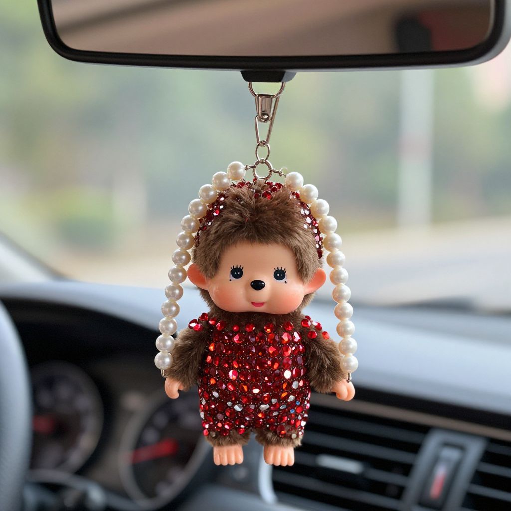 Monchichi doll rear view mirror charm bling red crystal monchhichi car pendant woman Car Accessories unique gift pearl chains