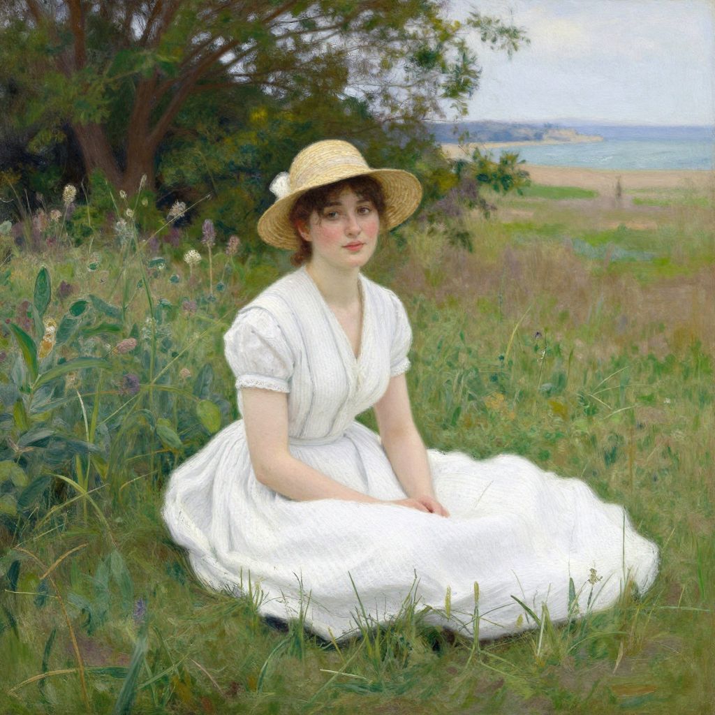Impressionist-style portrait of a young woman wearing a white dress and straw hat, seated on a grassy field. She is surrounded by lush greenery with a tranquil coastal backdrop featuring the sea and a soft sky, evoking a serene and nostalgic summer atmosphere.