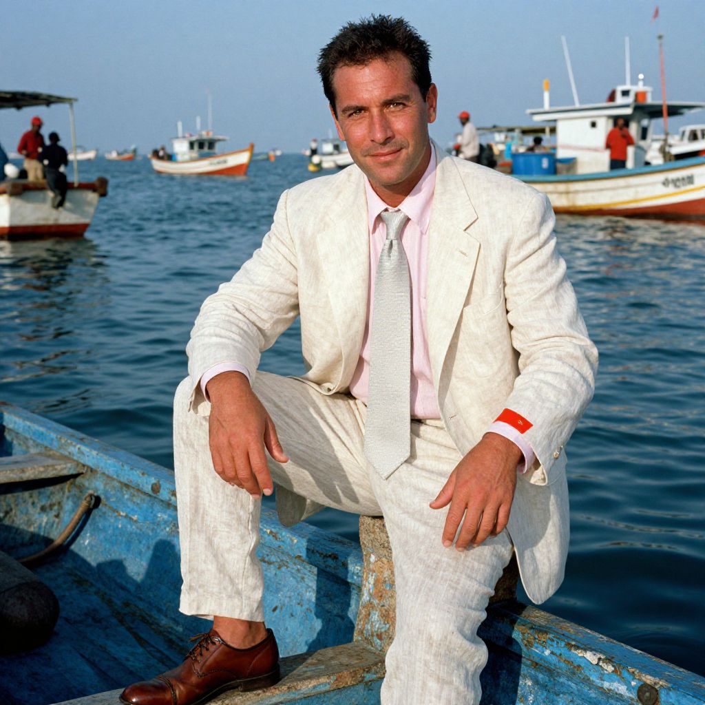 A man, ivory linen suit, pale pink dress shirt, light gray tie, brown leather derby shoes, glistening water, bustling fishermen, colorful fishing boats, technicolor analog film stock, relaxed smile, sun-kissed skin. Man has masculine face and piercing eyes