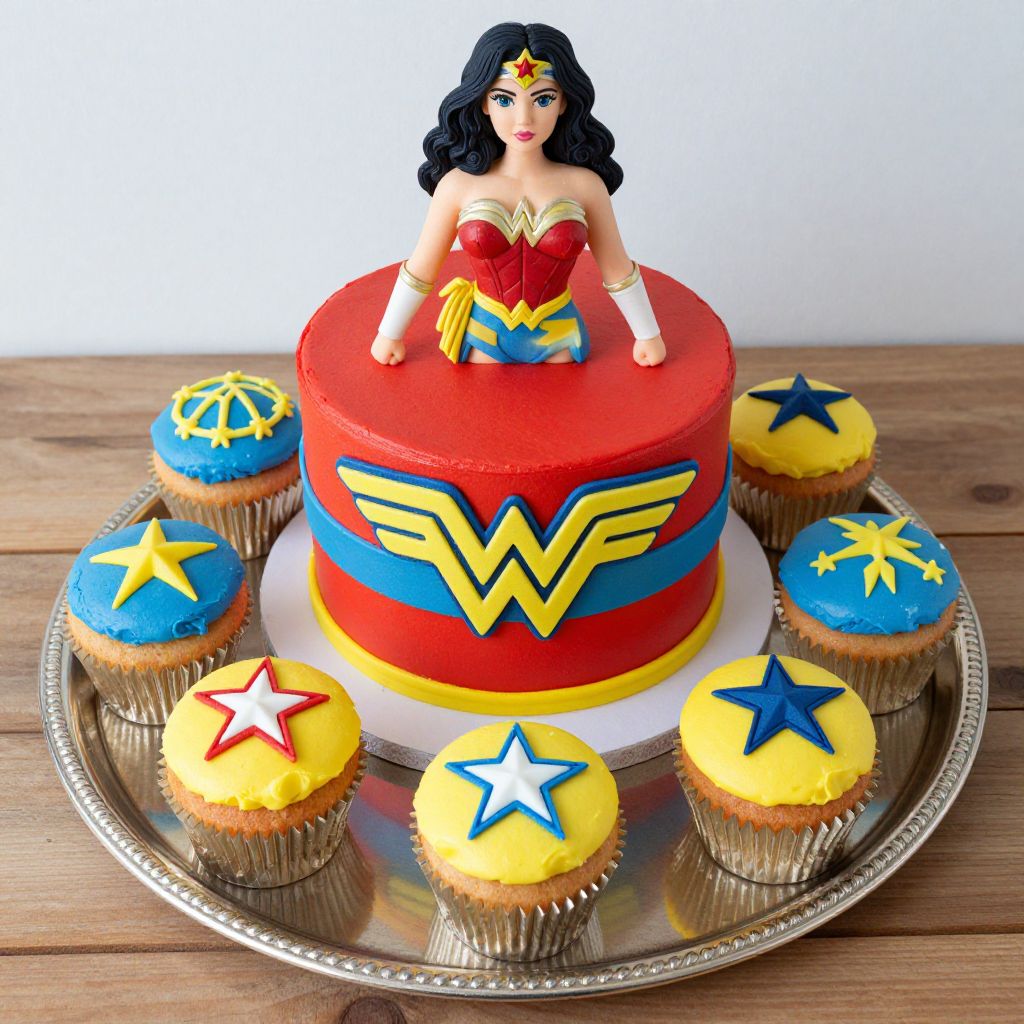 Photograph of a brightly colored, round cake and six cupcakes arranged on a silver tray. The cake, adorned with red and blue frosting and a yellow trim, features a large, gold Wonder Woman logo with outstretched wings on top. Surrounding the cake are six cupcakes, each decorated with yellow and blue frosting, each featuring different Wonder Woman-themed logos including a star, a circle with a star, and a shield. The background is a simple, dark wooden surface, and the overall style is vibrant and playful, appealing to fans of Wonder Woman.