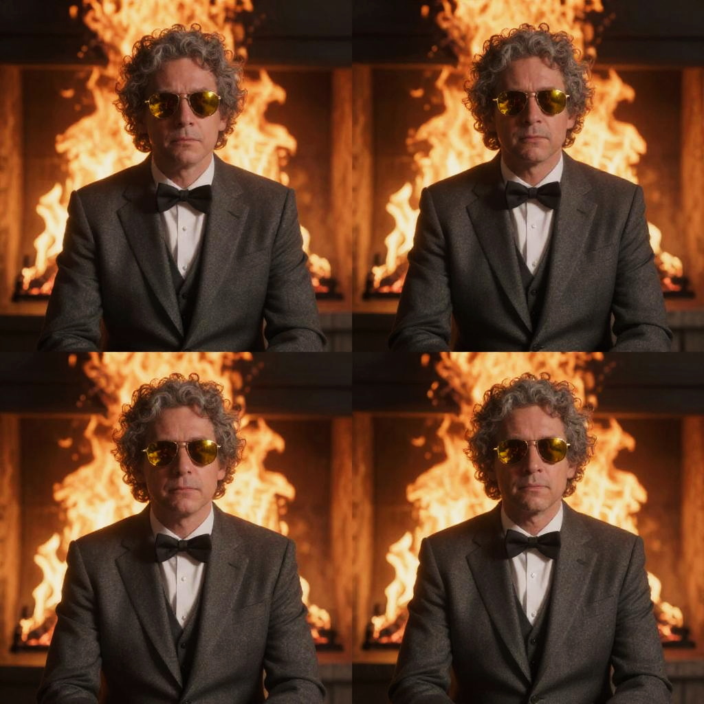 This photograph features a medium-close-up of a middle-aged man with curly gray hair, wearing dark sunglasses, a black tuxedo with a white shirt and black bow tie. He is positioned in front of a background of large, bright flames, creating a dramatic contrast with his dark attire. The image is a composite of four identical shots arranged in a 2x2 grid, emphasizing symmetry and repetition. The man's expression is serious and stoic, and the flames behind him add a sense of intensity and heat to the scene. The lighting highlights the man's face and suit, while the flames provide a warm, orange glow.