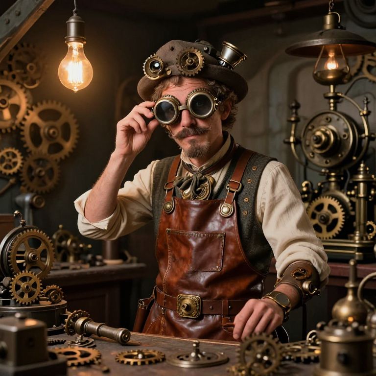 Steampunk inventor with goggles, brown leather apron, white shirt, and brass hat adjusts glasses in dimly lit workshop, surrounded by gears.