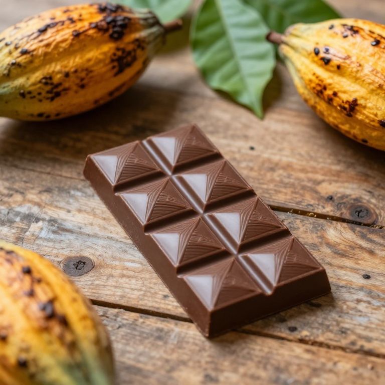 Freia chocolate bar resting on a rustic wooden table surrounded by fresh cacao pods and green leaves, soft natural lighting highlighting the glossy chocolate surface, warm and cozy atmosphere, hyper-realistic detail, vibrant colors