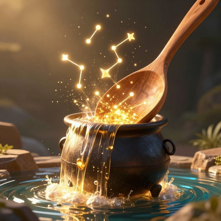 A mystical 3D-rendered scene depicts a colossal wooden spoon stirring a simmering cauldron brimming with radiant, golden constellations, as cosmic energy cascades into a shimmering pool below, illuminated by dramatic golden-hour lighting.