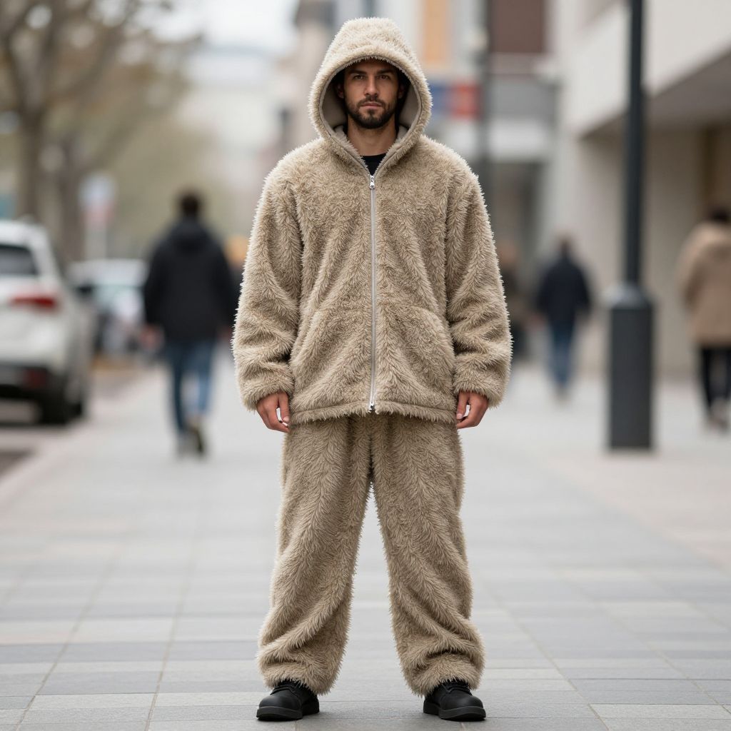Fleece costume, solo, male focus, 1boy, full body, hood, outdoors, realistic, standing, jacket, blurry background, facial hair, hood up