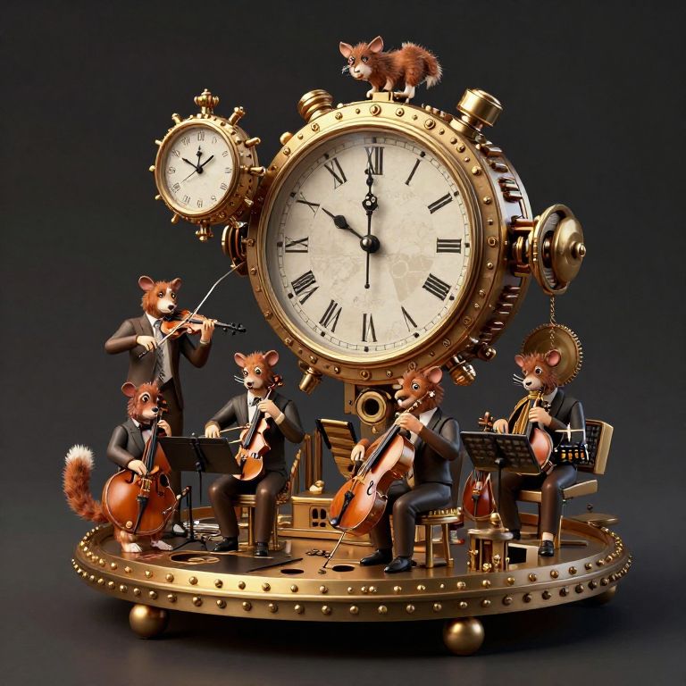 A highly detailed, digital CGI image depicting an anthropomorphic fox band playing around a large, vintage-style, brass clock with Roman numerals. The six fox characters, dressed in black tuxedos, are positioned on and around the clock. One fox stands on top of the clock, playing a small drum, while others play various instruments including a cello, double bass, violin, and a flute. The background is a gradient of dark to black, emphasizing the golden clock and the fox musicians. The clock's intricate design includes gears and a small pendulum. The overall style is whimsical and steampunk-inspired.