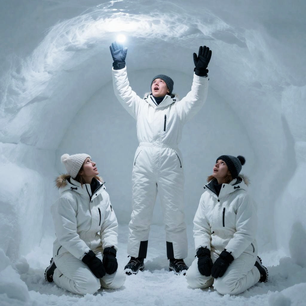 Photograph of a man and a young girl sitting on white, icy steps inside an igloo. Man has dark hair, beard, wearing a dark jacket and beige blanket. Girl has brown hair, wears dark jacket and blue jeans. Both look at each other warmly. Fire burns in a metal ring on the floor in front. Silhouetted figure stands in the background, partially obscured.