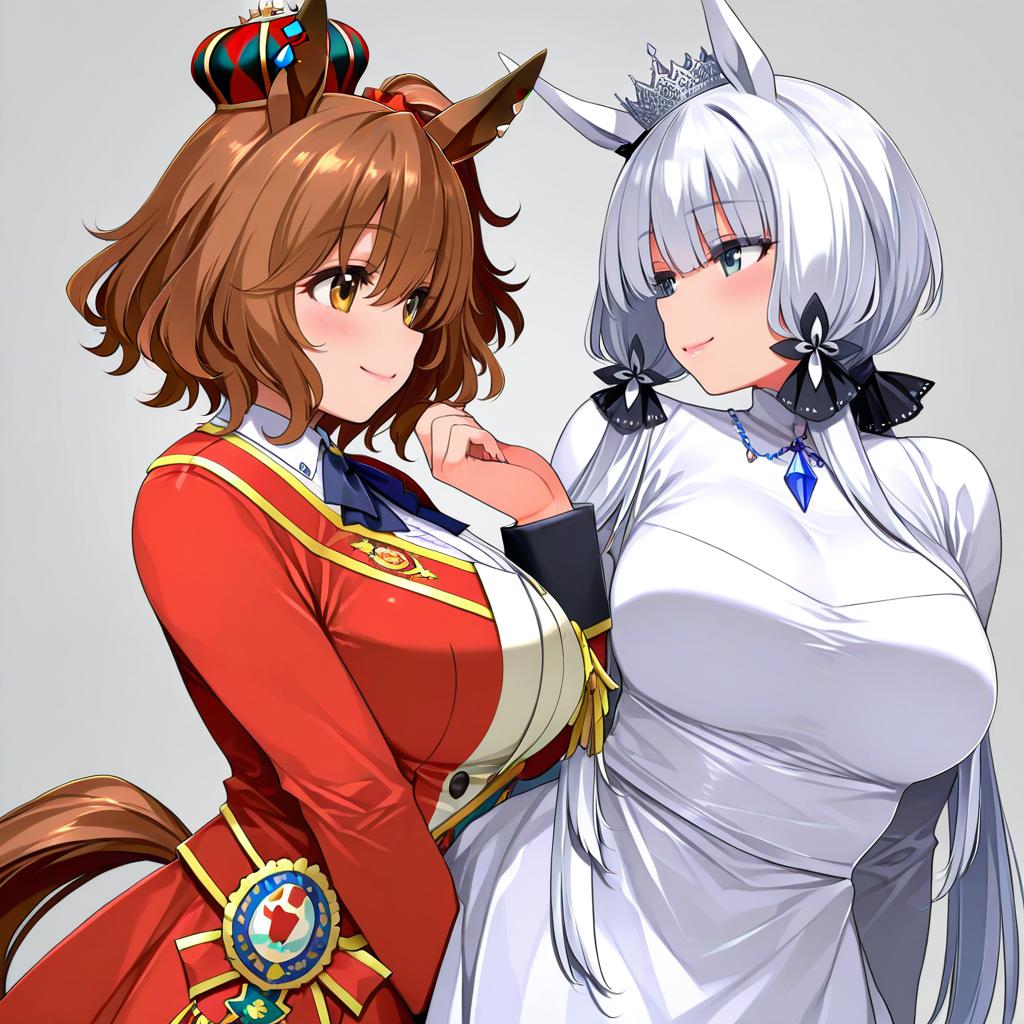 Aston machan (umamusume), umamusume, 1girl, horse girl, horse ears, horse tail, green eyes, hair between eyes, brown hair, medium hair, large breasts, medium breasts, long sleeves, crown, by artist happa (cloverppd), illustrious