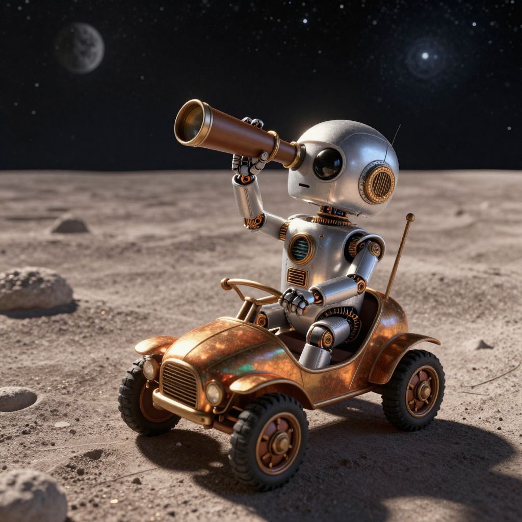 A captivating digital artwork depicting an endearing, inquisitive robot perched on an antique moon buggy. From above, this surreal tableau unfolds as the robotic figure looks up at the expansive celestial expanse, holding a telescope to its eye. The surrounding lunar terrain is softly illuminated by warm light reflecting off the vehicle, casting elongated shadows and evoking a sense of both enchantment and reminiscence. This alluring image seamlessly merges technology with human emotion, drawing viewers into an awe-inspiring connection with the mysterious cosmos above.