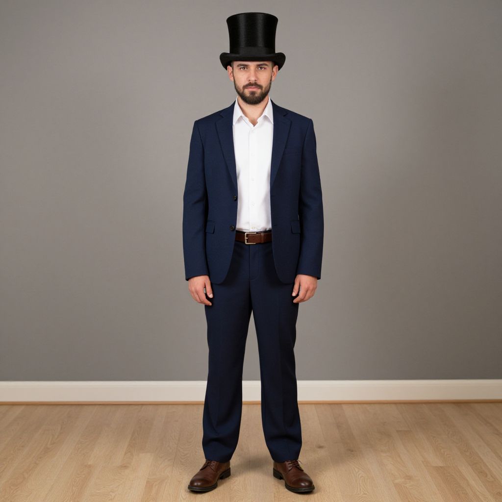 Costume man, 1boy, male focus, solo, hat, facial hair, top hat, brown footwear, standing, pants, jacket, full body, shirt, white shirt, indoors, belt, beard, shoes, blue jacket, brown belt, long sleeves