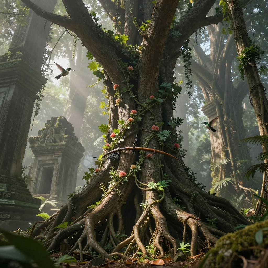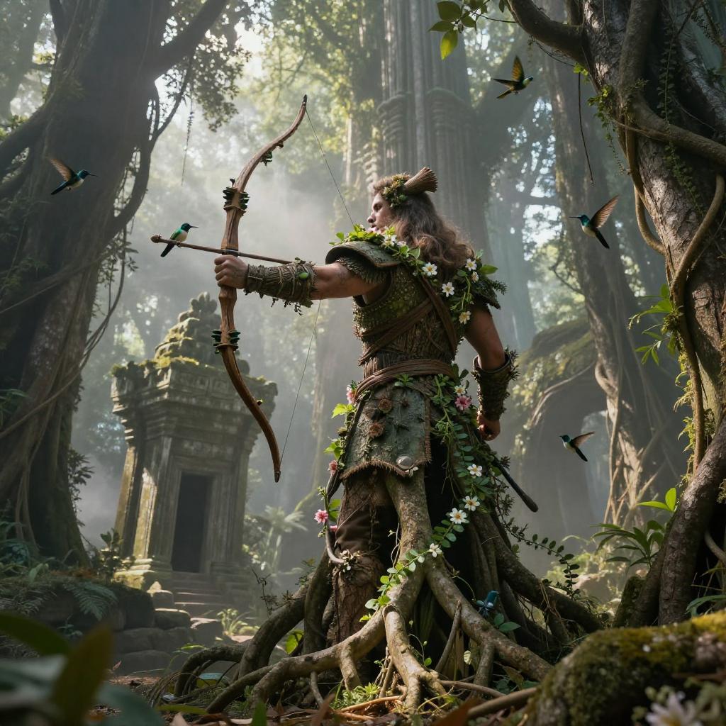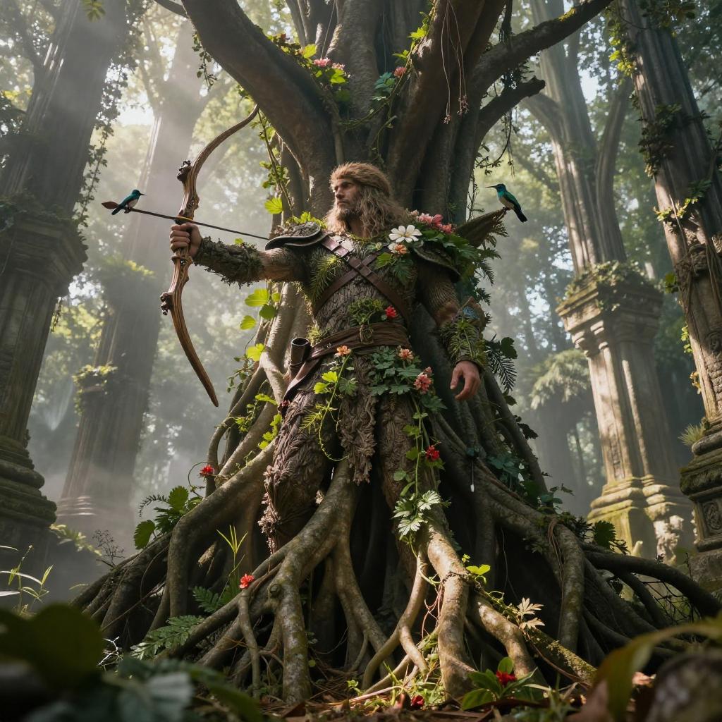 Verdant treant archer living bark armor, flowering vines, hummingbird familiars perched in sunlit cathedral-canopy spire of intertwined roots and ancient stone, mist-dappled morning light. Shot on Sony Alpha 1 with 35mm FE GM lens, (hyperdetailed), 8K HDR, dramatic lighting, cinematic atmosphere.