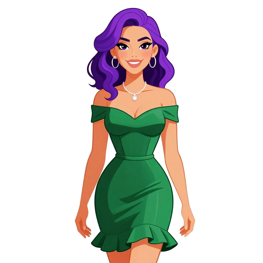 Digital anime-style drawing of a purple-haired woman with fair skin, wearing a tight, green, long-sleeve dress with yellow studs, standing against
