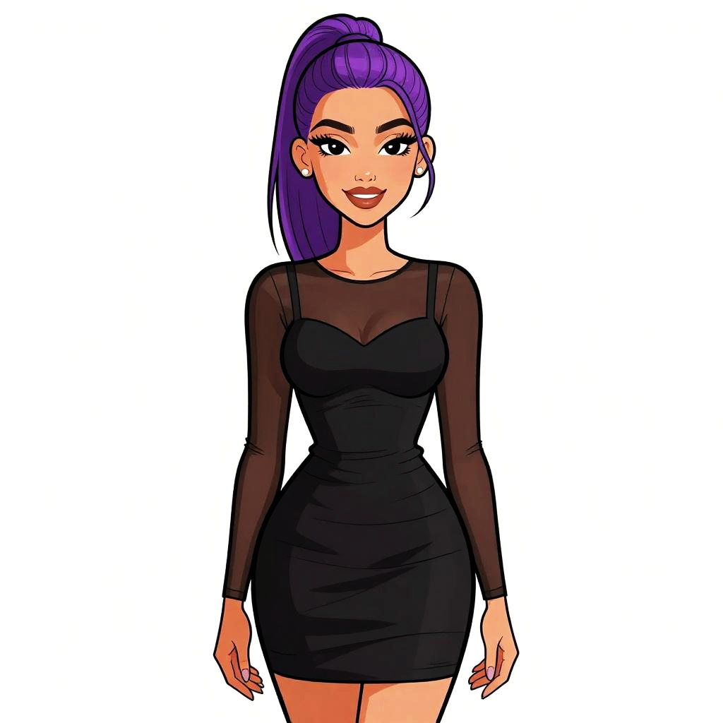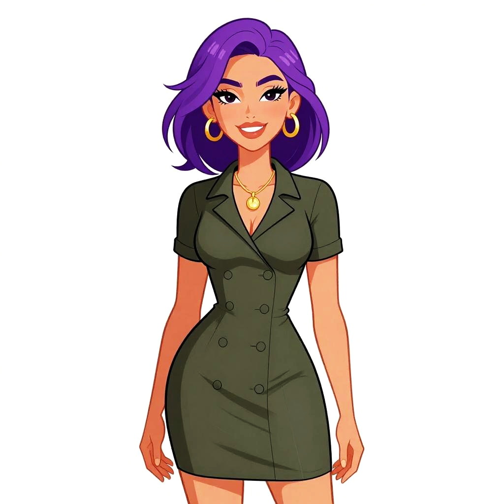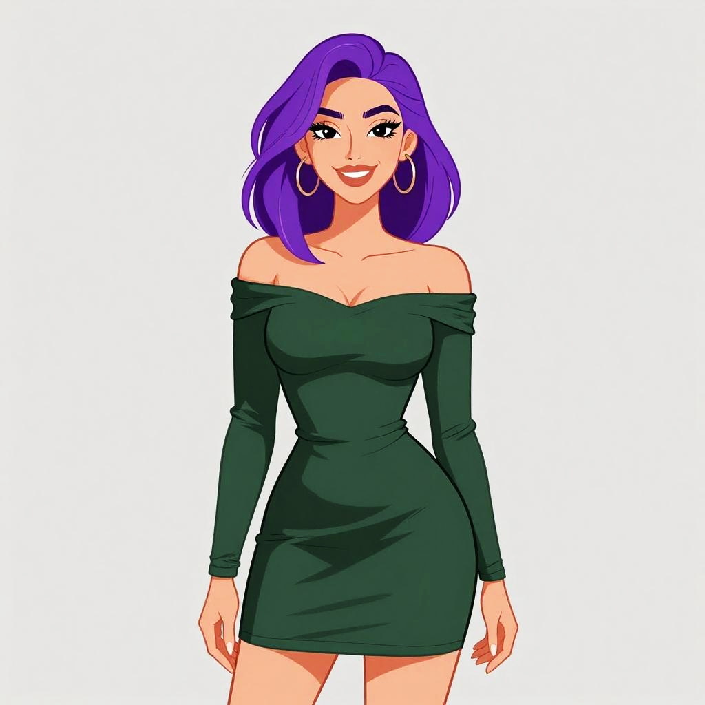 This is a digital illustration of a fair-skinned woman with purple, shoulder-length hair and large, expressive eyes. She wears a form-fitting, long-sleeved, dark green dress with a square neckline and yellow studded trim along the edges. The dress accentuates her curvy figure and reveals a modest cleavage. The background is plain white, making the woman the focal point. The illustration has a bold, anime-inspired style with clean lines and vibrant colors. Her expression is neutral, and she stands confidently with her arms relaxed by her sides.