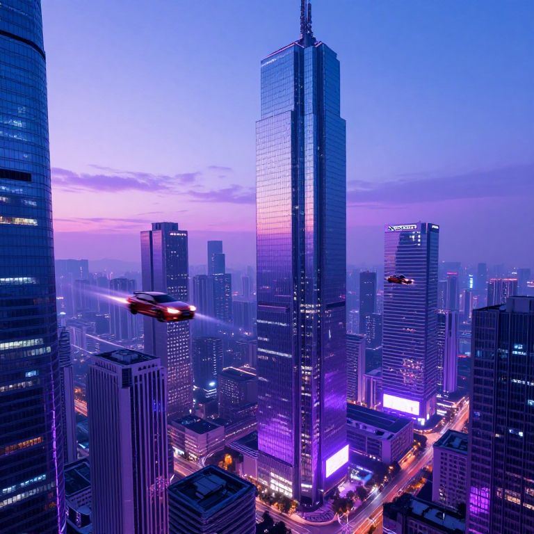 Plxlr futuristic cityscape at dusk, neon lights reflecting on glass skyscrapers, flying cars zooming past, cyberpunk aesthetic with vibrant purples and blues, detailed and immersive digital art